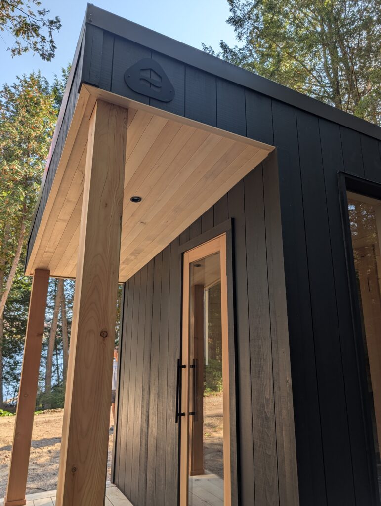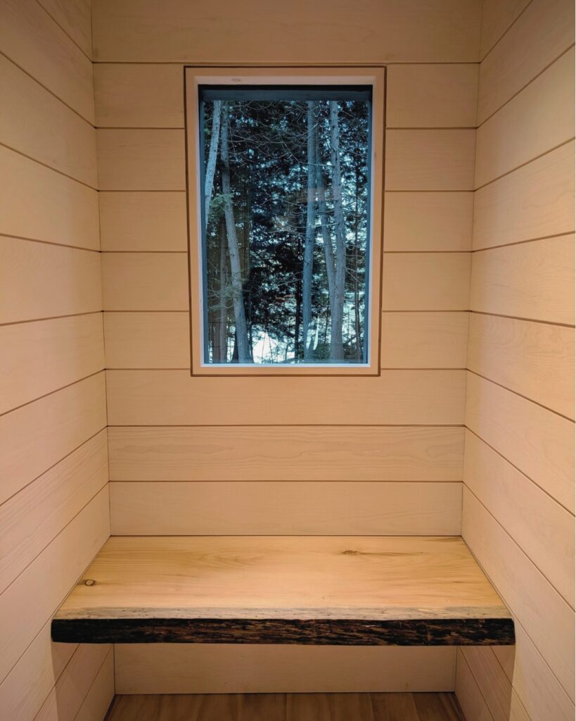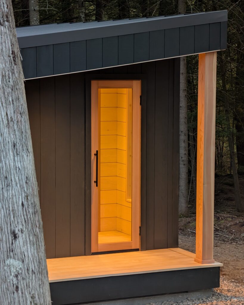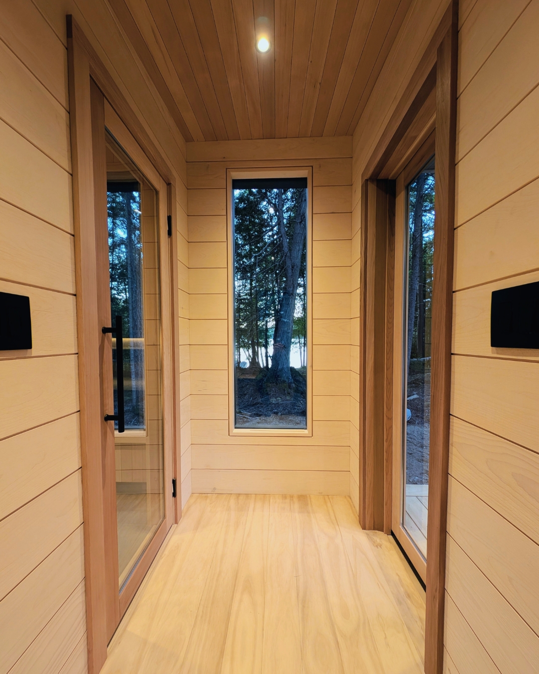 The key feature of the Model 2 is the change room. The change room is not just a place to hang your clothes. It’s a space that buffers the hot room from the cold winter air. It’s a dry space for storage of linens, accessories, and firewood. And it’s a place to hang out as you calibrate your body temperature between between sessions in the hot room.
