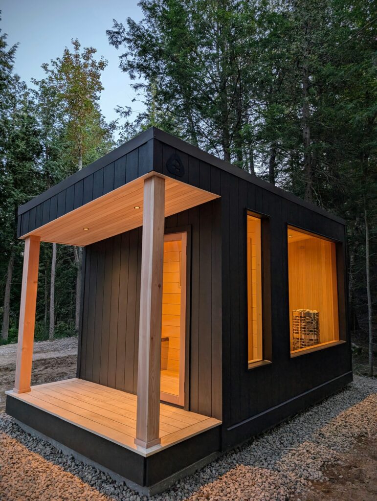 • A compact 12v solar system with transportable/chargeable battery bank powers all lighting and charging stations. This opens up a world of possibilities in terms of the location of your sauna.